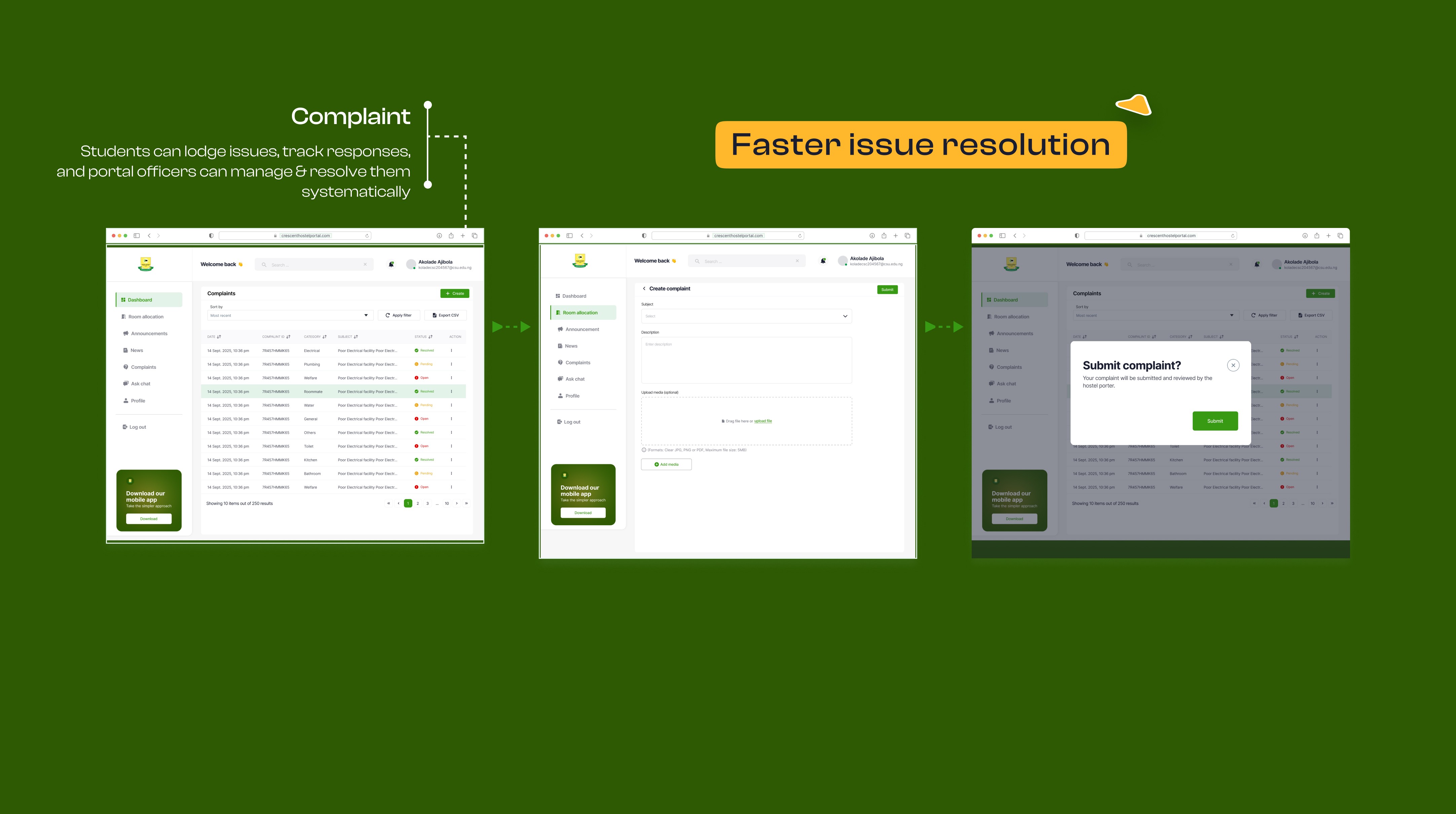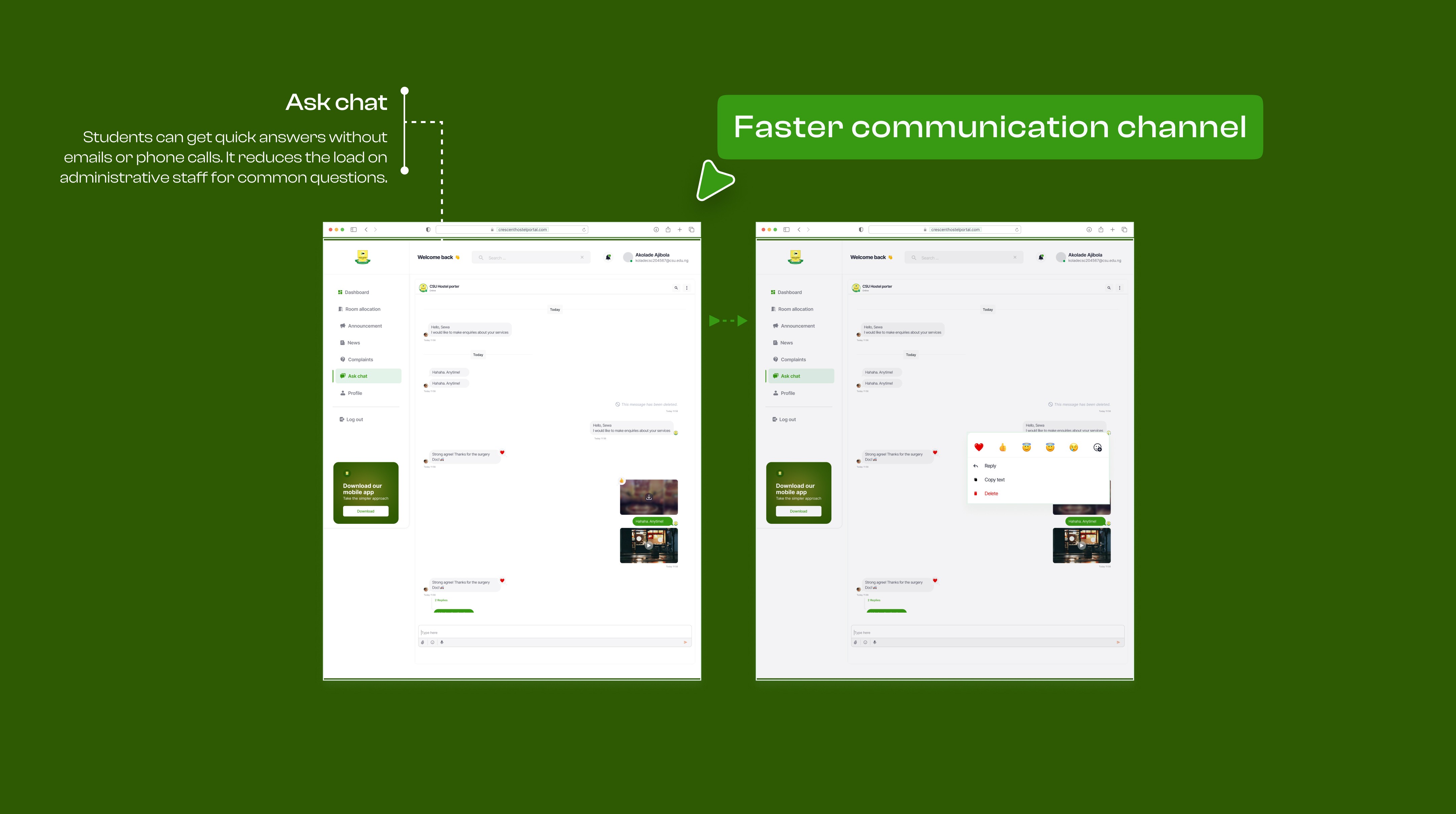 Four features born from user requests: Campus news and announcements so students stay informed. Ask Chat for quick answers without hunting down emails. And a Complaints page that tracks issues to resolution—not into a void.