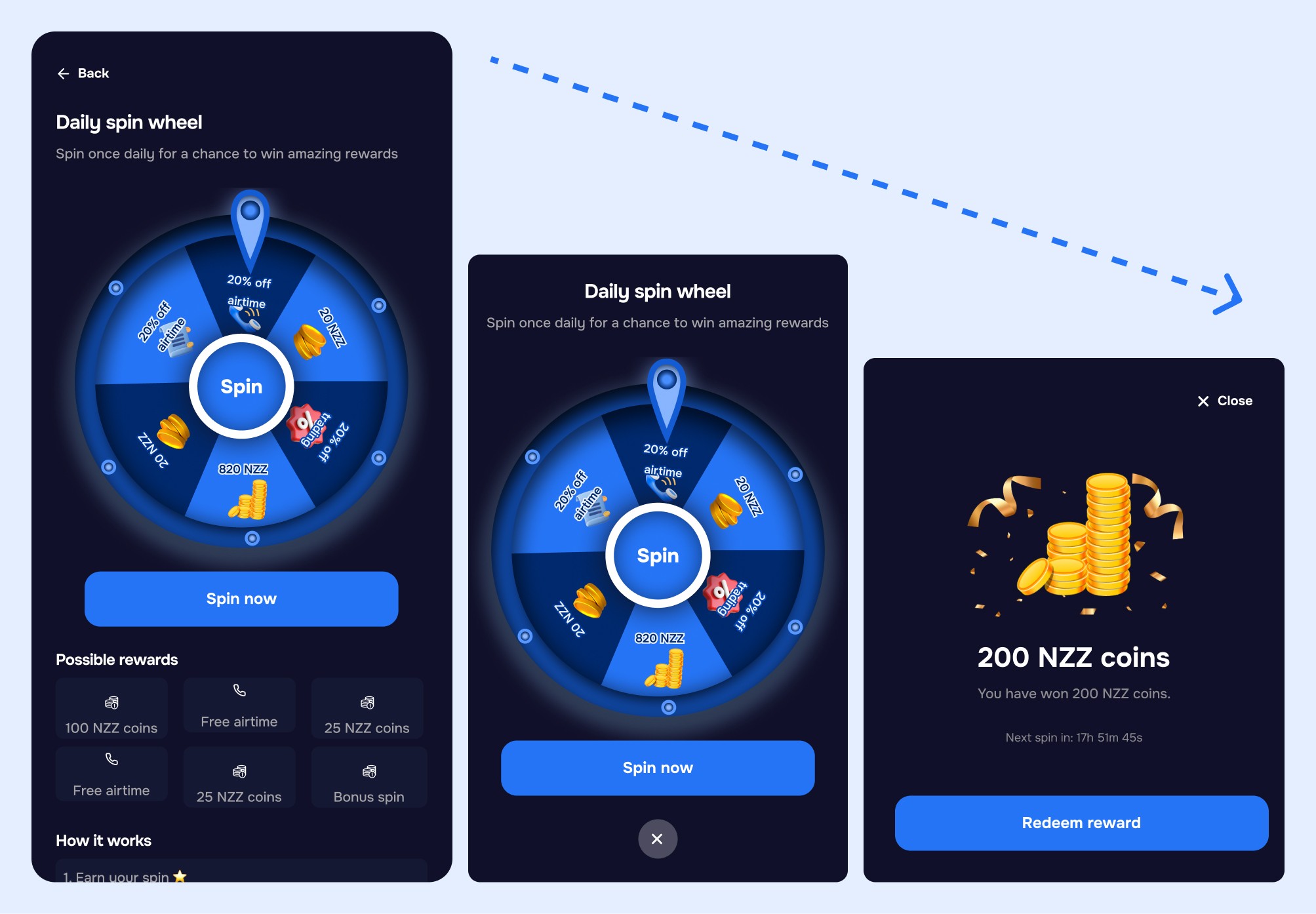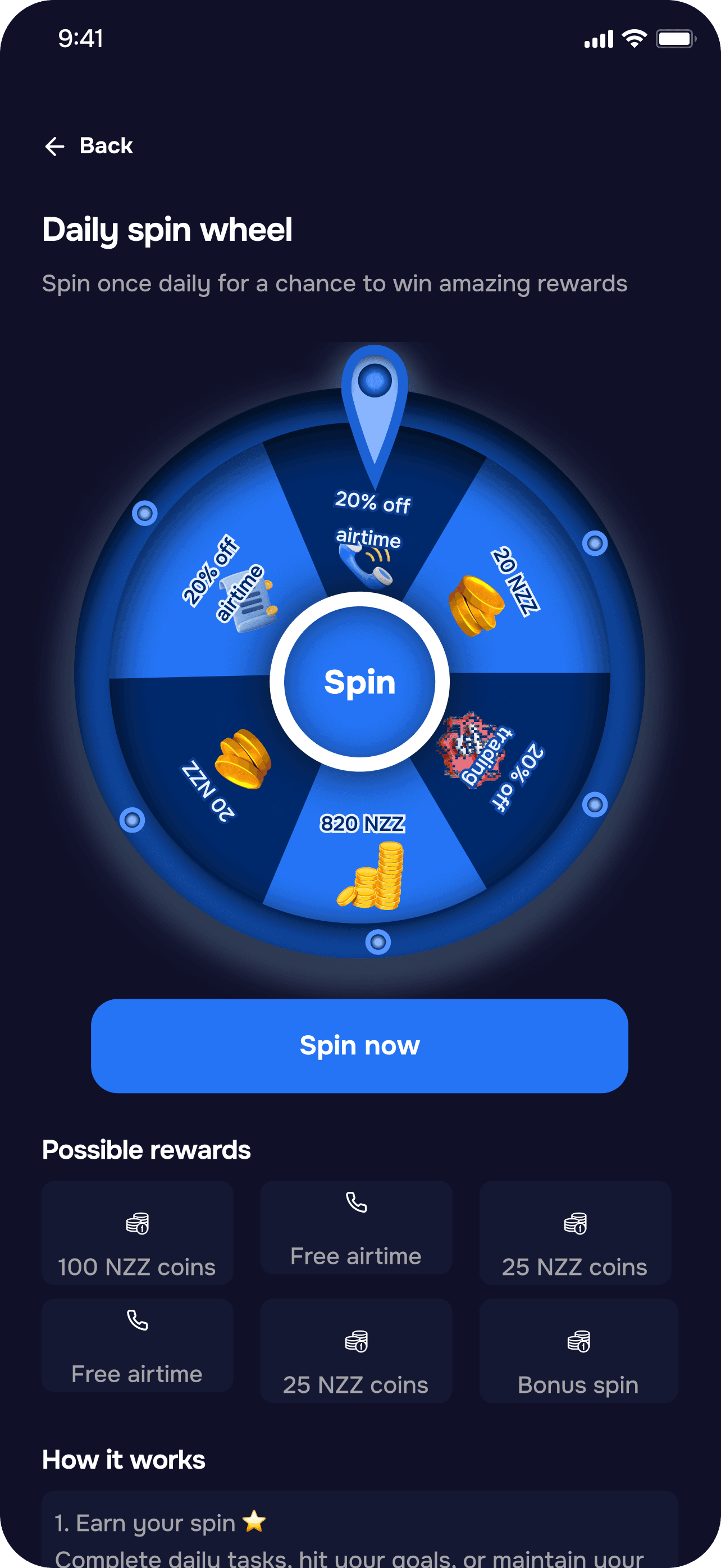 1 free daily spin landing on points, coins, or a cash prize.