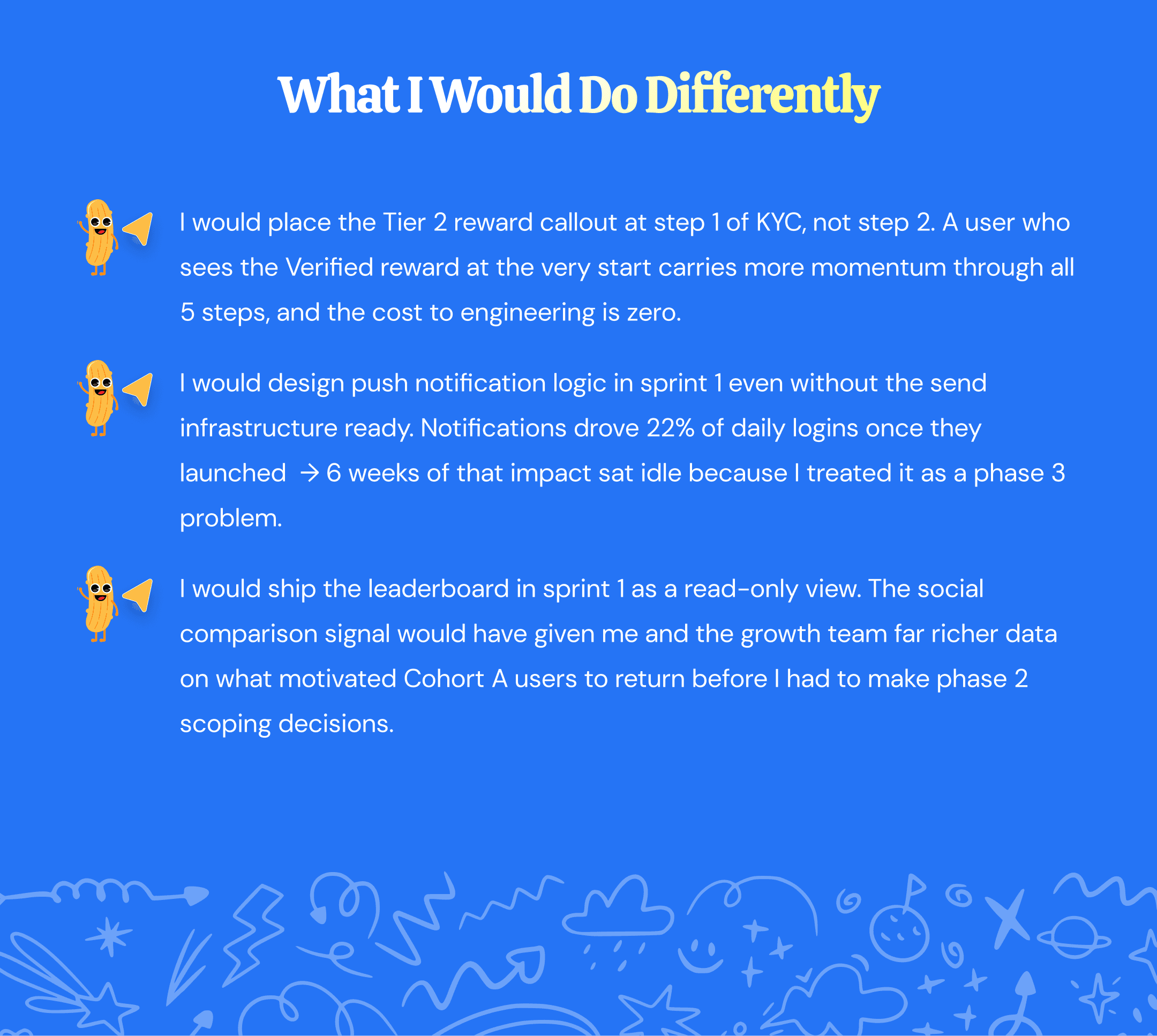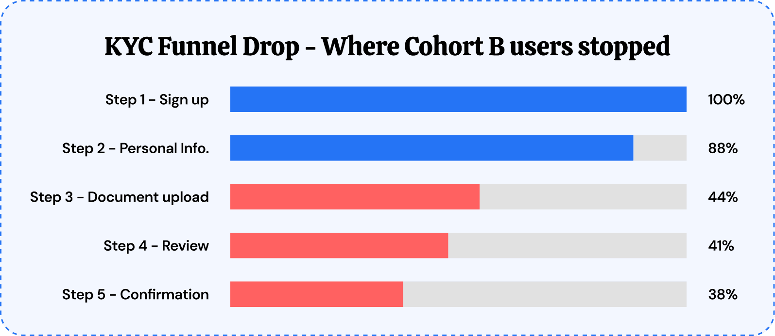 I placed the Tier 2 reward preview at step 2 of the KYC flow, not after step 5. Cohort B users were already reaching step 2 — they just could not see what finishing was worth. That single placement decision changed the frame from compliance task to progress milestone.