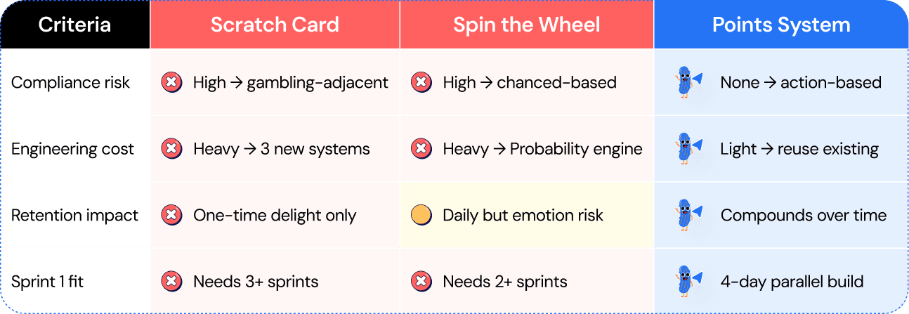 I moved to a points and milestones system — deterministic, not chance-based., which meant that every reward is tied to something the user did, not something they were lucky enough to receive.