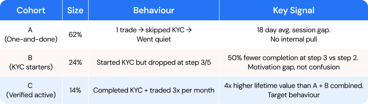 The growth team shared cohort data that told a clear story. We grouped users into 3 behavioural segments based on how they engaged with the app after sign-up.