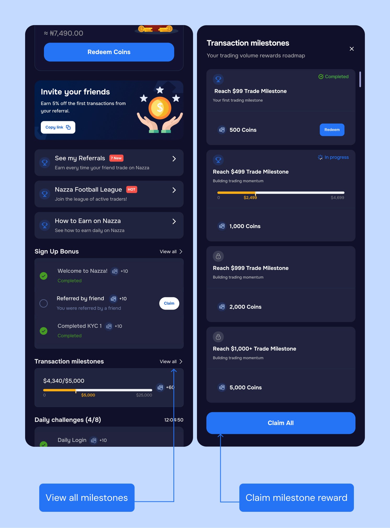 Designed a rewards system that drove 15% of users to complete KYC and reverse a reverse in retention decline across Nazza mobile & web trading app