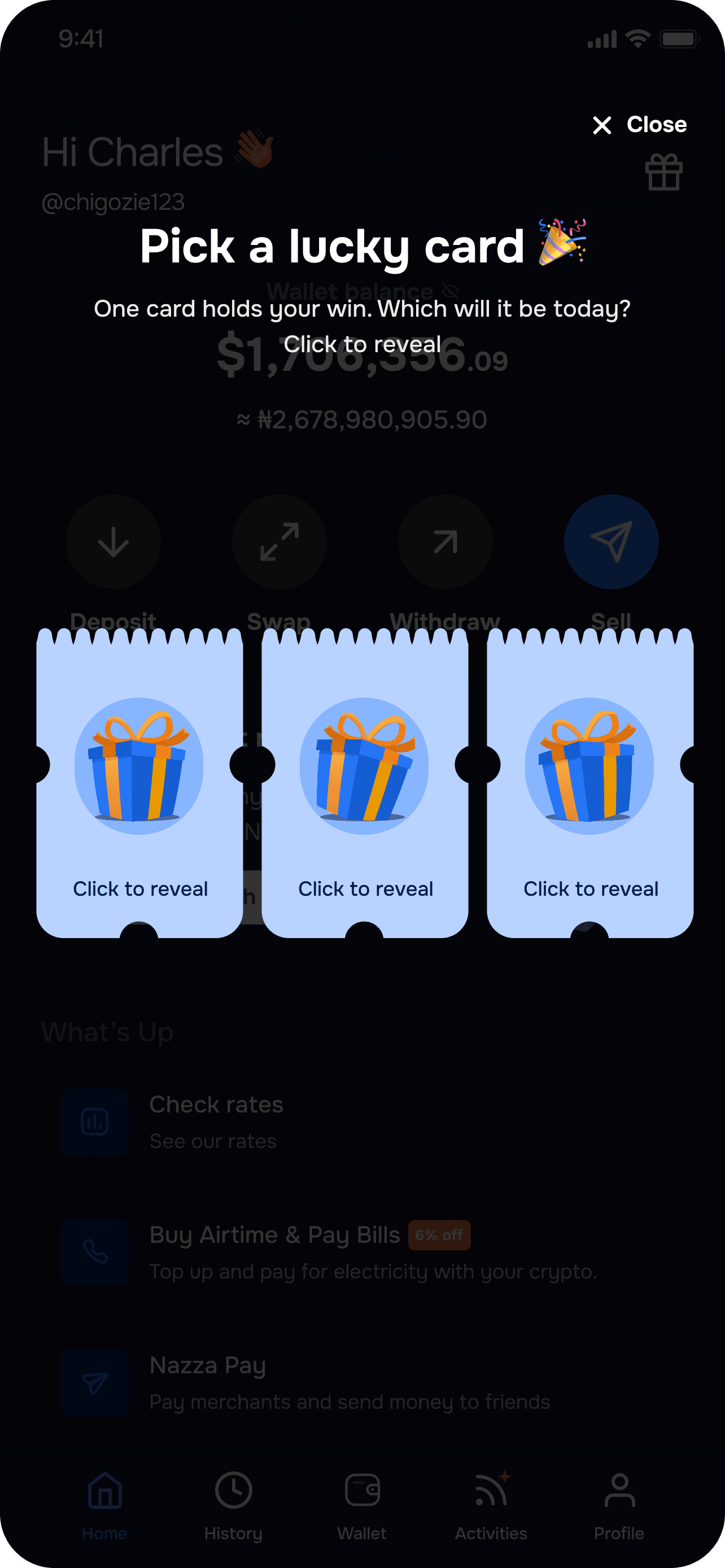 Users tap a card after each trade to reveal a coin or cash bonus.
